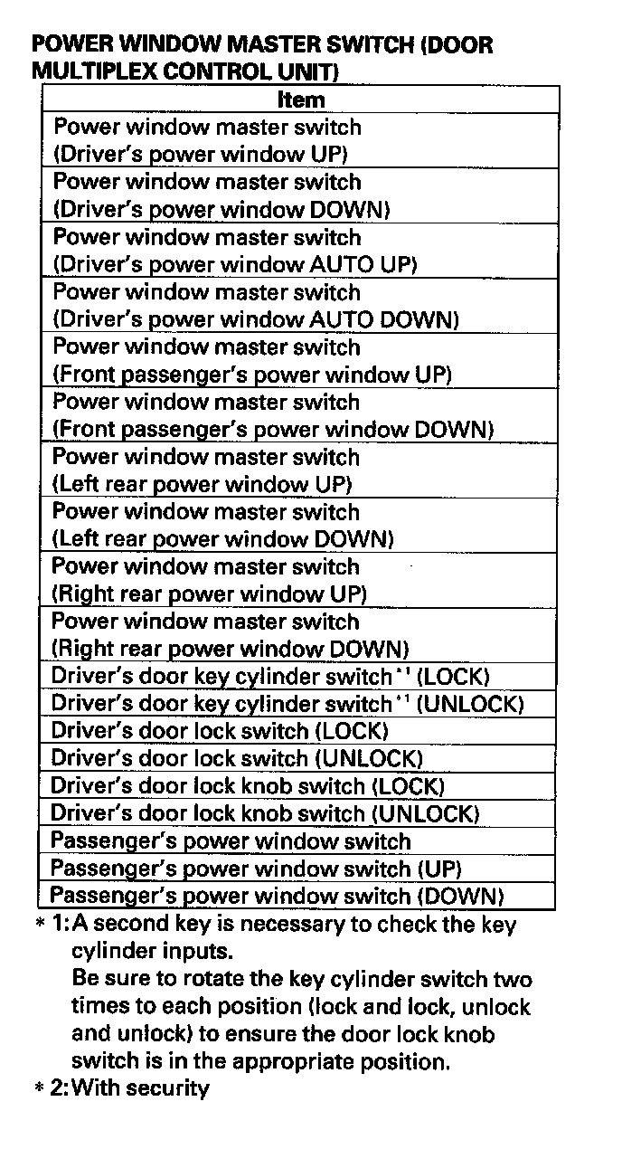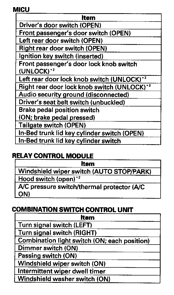 11. The following tables list the circuits that can be checked in Test Mode 2. Operate the switch that is most closely related to the problem. If the circuit is OK, the map lights will blink once. If the circuit is faulty, there will be no indication.