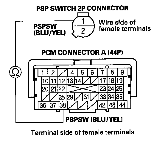 22. Check for continuity between PCM connector terminal A38 and PSP switch 2P connector terminal No. 1.