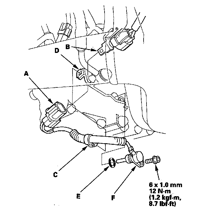 6. Install a new O-ring (E) on the new ATF temperature sensor (F).