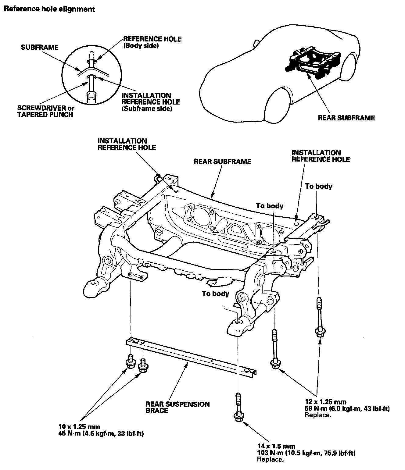 After loosening the subframe mounting bolts, be sure to replace them with new ones.