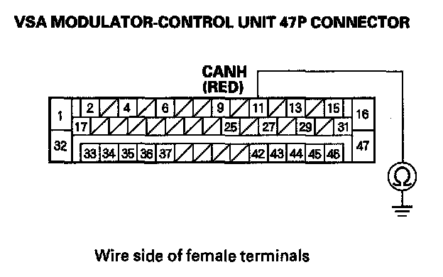 10. Check for continuity between VSA modulator-control unit 47P connector terminal No. 11 and body ground.