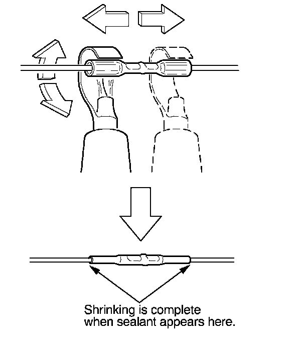 13. Plug in the heat gun, and turn it on. Start at the middle of the splice connector, and move the gun toward the ends as the tube shrinks. Apply heat evenly by rotating the curved heat spreader around the splice connector. Shrinking is complete when a small amount of sealant appears at each end of the tube.