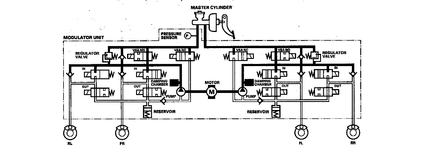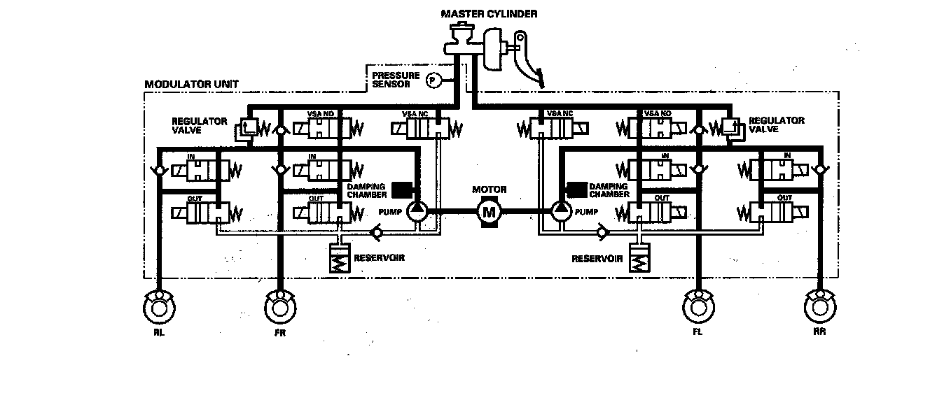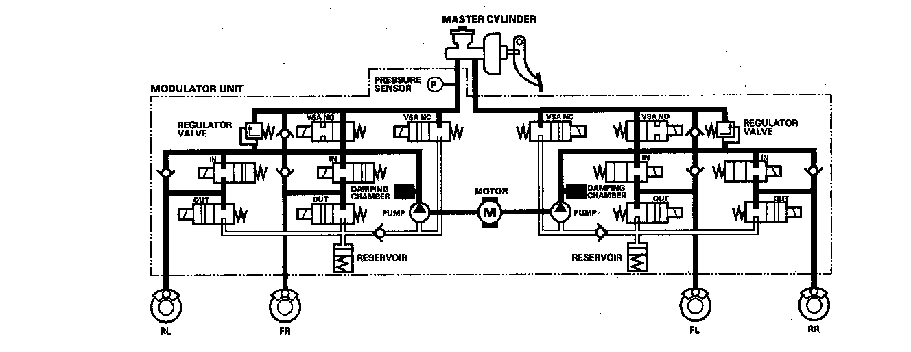 VSA NO valve open, VSA NC valve closed, inlet valve open, outlet valve closed. Master cylinder fluid is pumped out to the caliper.
