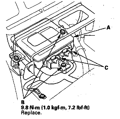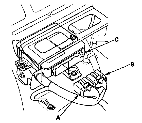 1. Install the SRS unit (A) with new TORX bolts (B), then connect the connectors (C) to the SRS unit-push them into position until they clicks.
