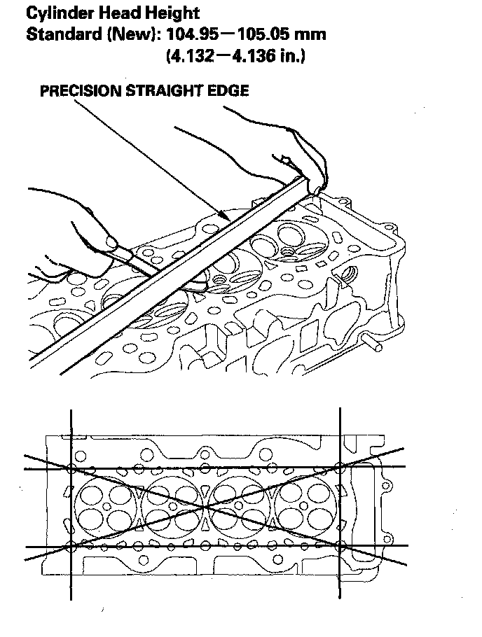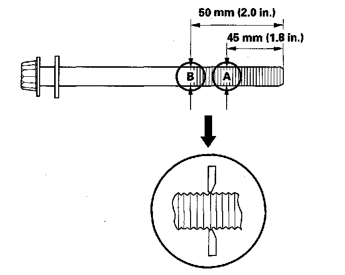 Measure the diameter of each cylinder head bolt at point A and point B. If either diameter is less than 11.5 mm (0.45 inch), replace the cylinder head bolt.