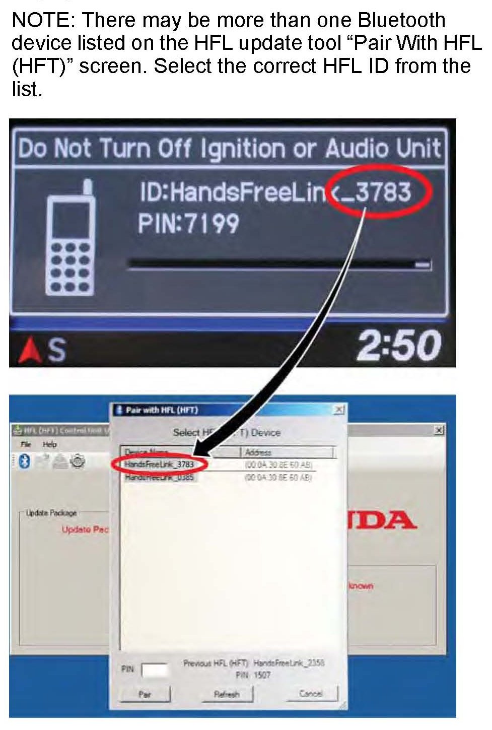 16. In the HFL update tool, select the correct Bluetooth device (if more than one appears) that matches the HandsFreeLink ID code shown in the vehicle's display screen.