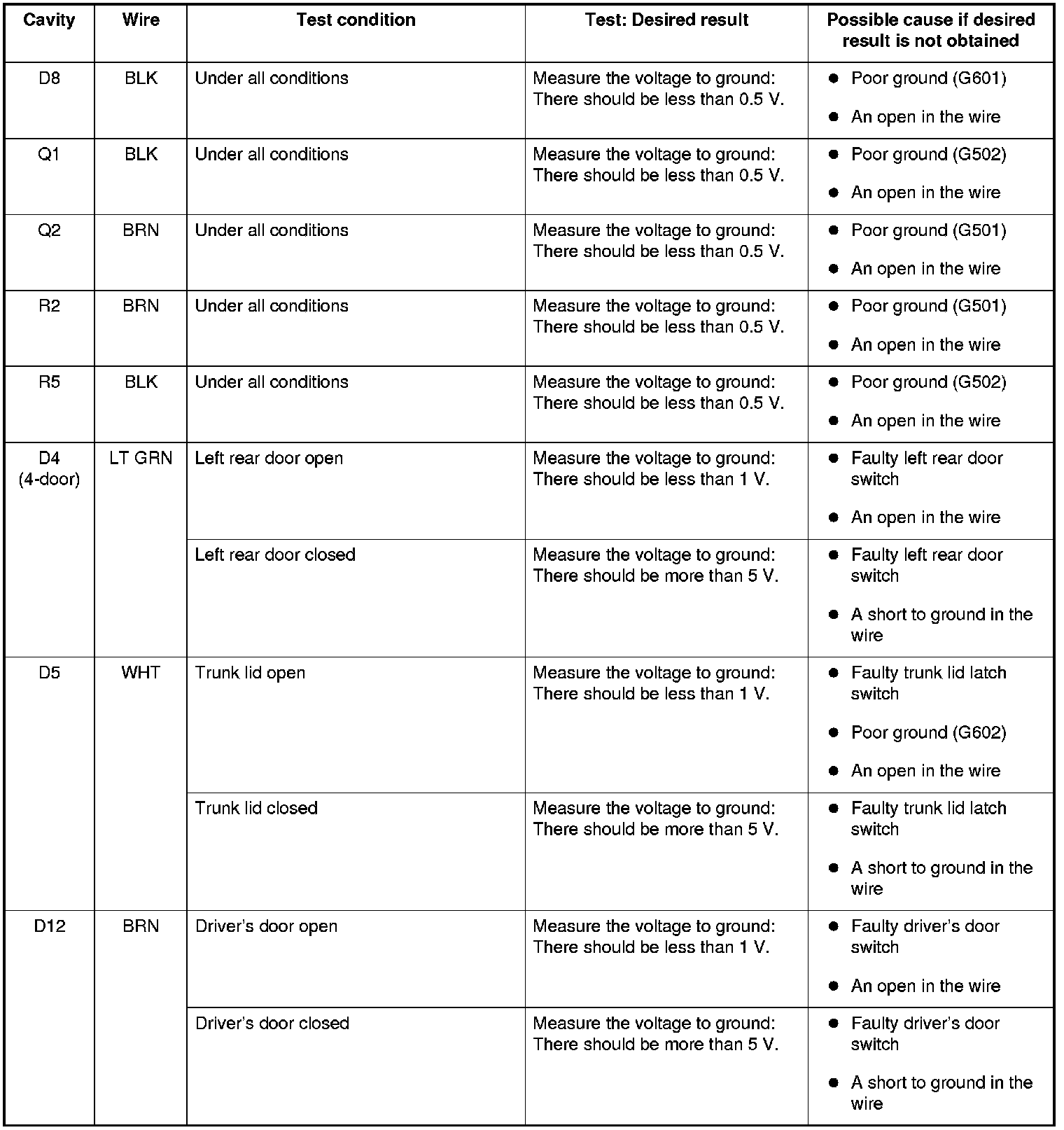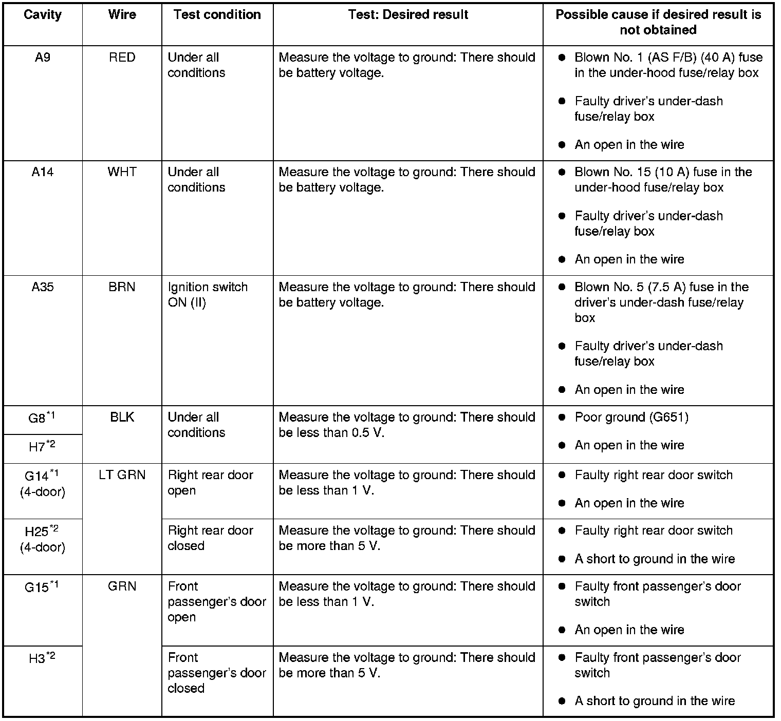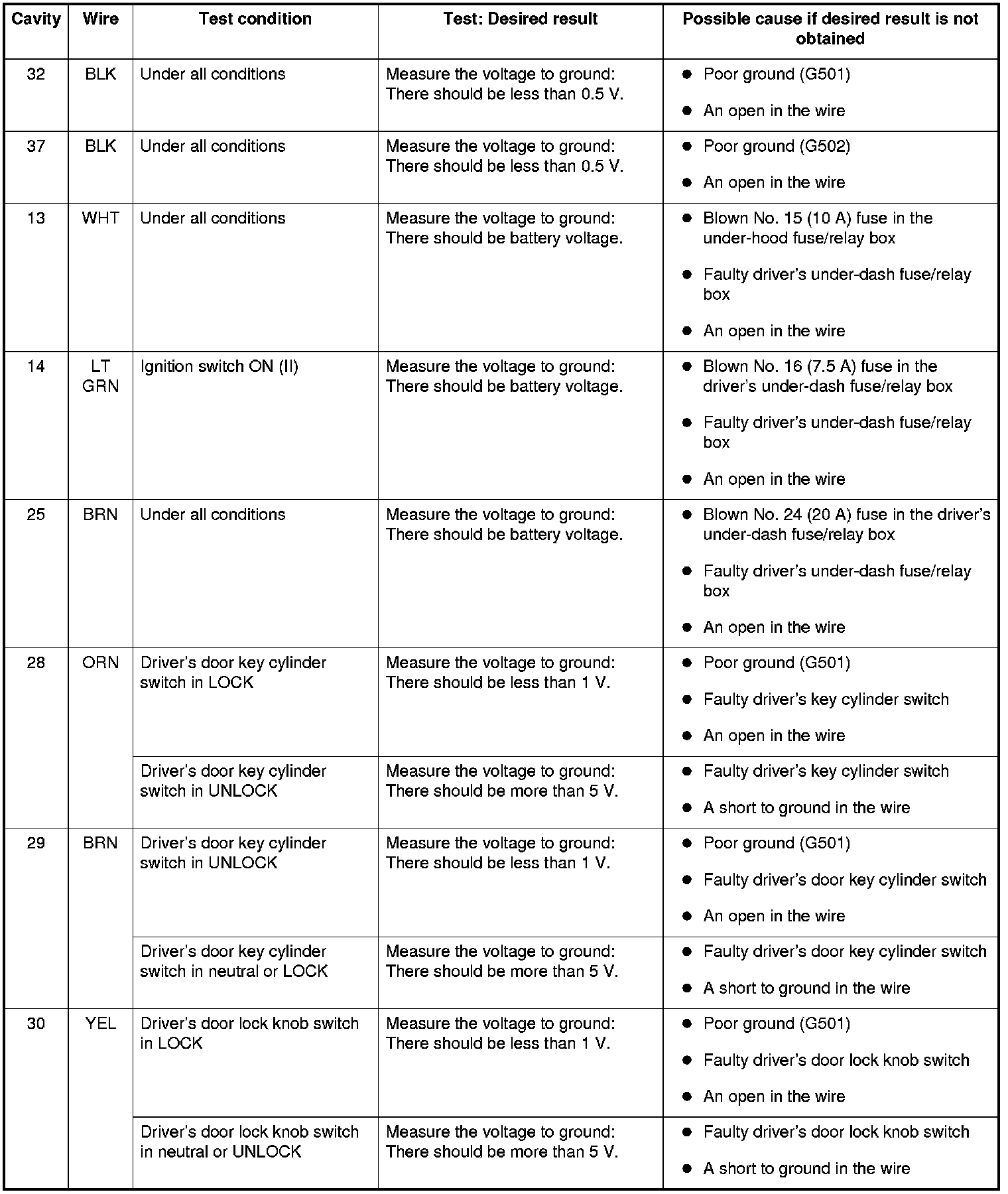 5. Reconnect the remaining connectors to the driver's under-dash fuse/relay box, and make these input tests at the connectors.