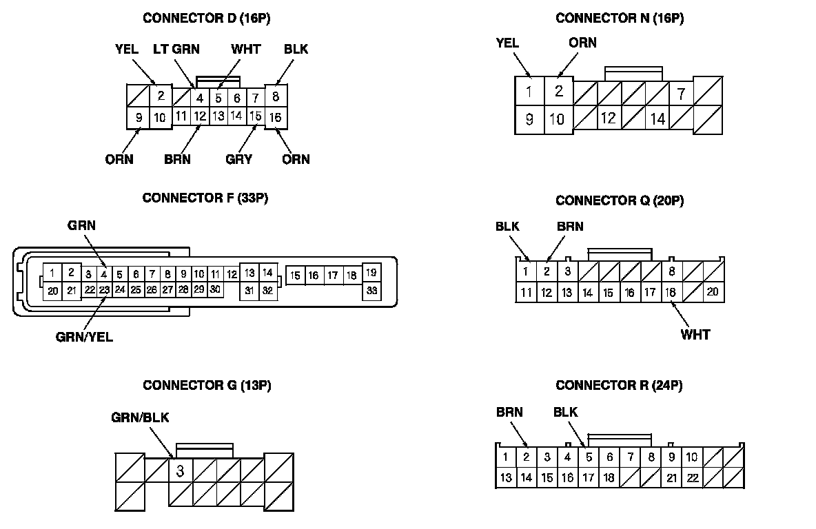 2. Disconnect driver's under-dash fuse/relay box connectors D, F, G, N, Q, and R.