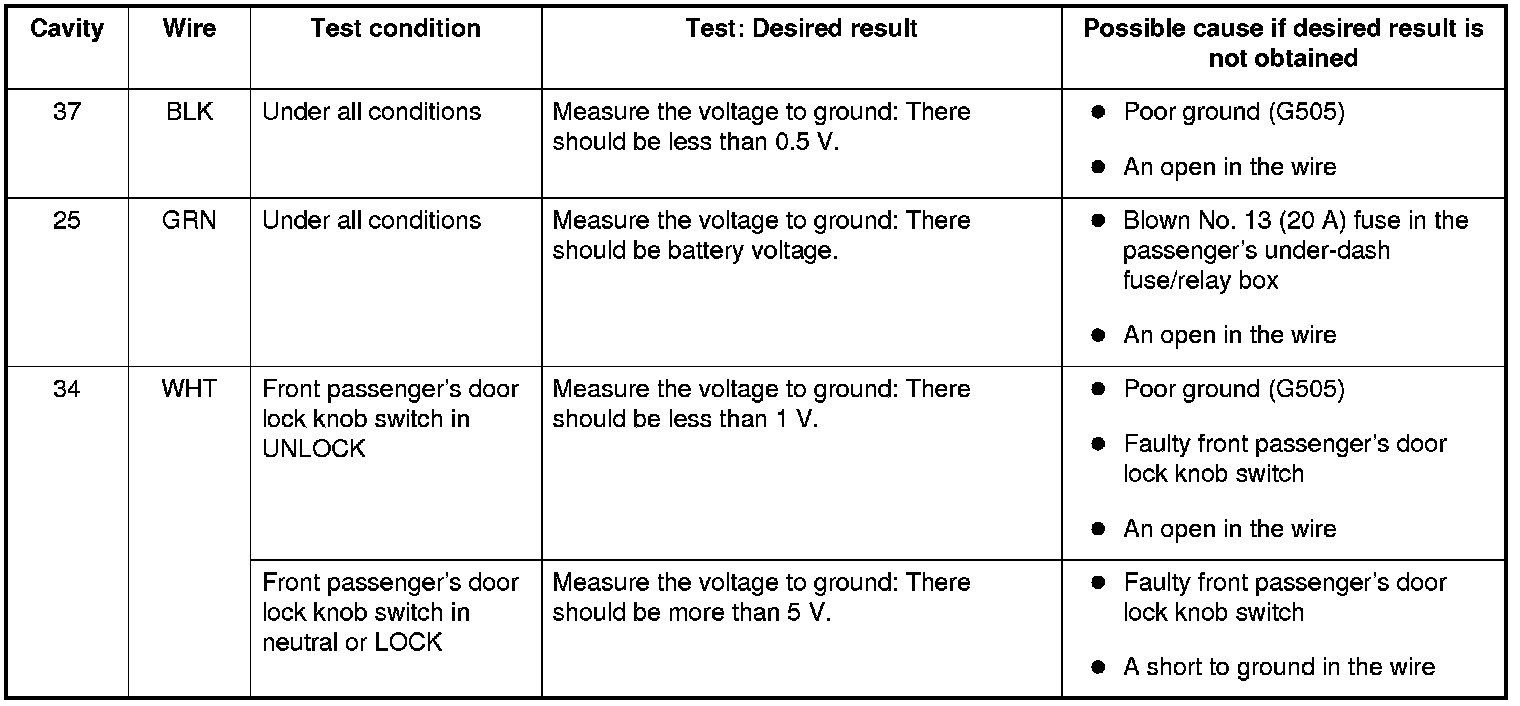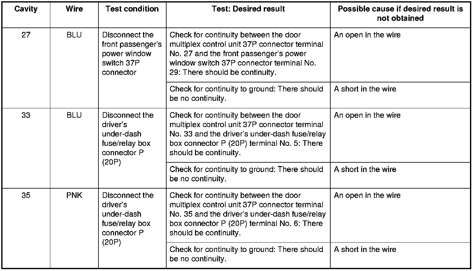 19. Reconnect the 37P connector to the front passenger's power window switch, and do these input tests at the following connector.