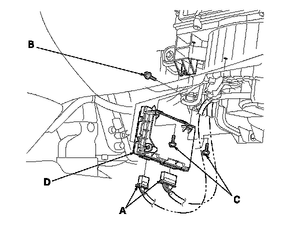 2. Disconnect the connectors (A). Loosen the bolt (B) and remove the bolts (C) from the climate control unit (D).
