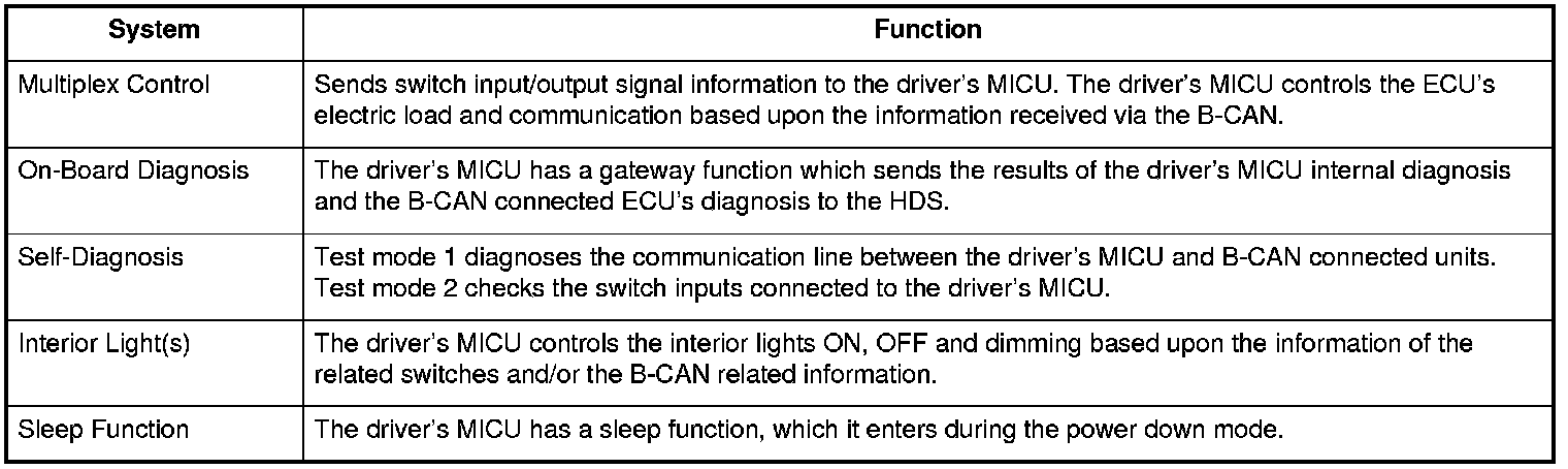The driver's MICU (built into the under-dash fuse/relay box) is one of the B-CAN components. The driver's MICU controls many systems related to the body controller area network and the security system, and also works as a gateway to diagnose the other B-CAN connected ECUs with the HDS.