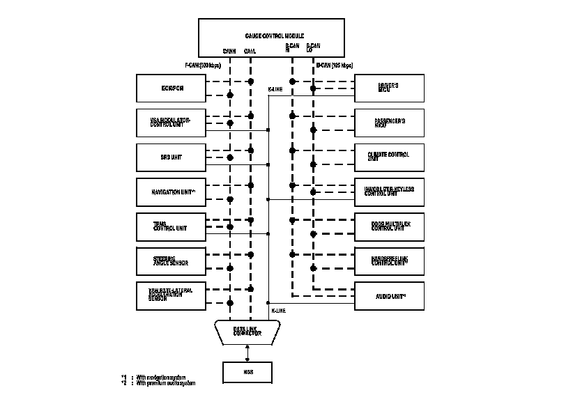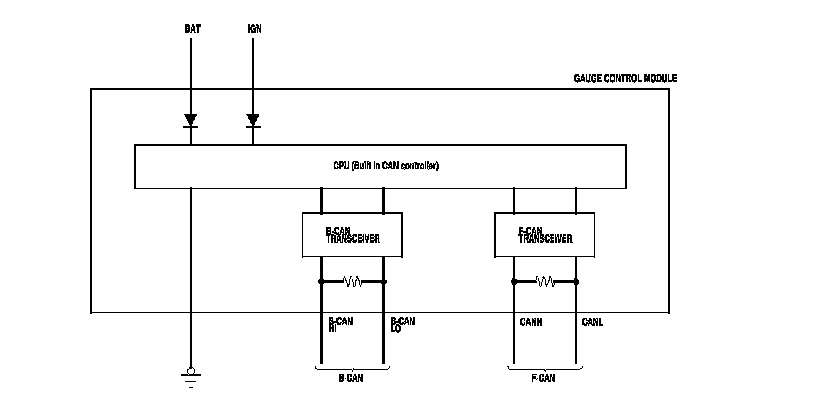 The body controller area network (B-CAN) and the fast controller area network (F-CAN) share information between multiple electronic control units (ECUs). B-CAN communication moves at a slower speed (125 kbps) for convenience related items and for other functions. F-CAN information moves at a faster speed (500 kbps) for "real time" functions such as fuel and emissions data. To allow both systems to share information, the gauge control module translates information from B-CAN to F-CAN and from F-CAN to B-CAN.
