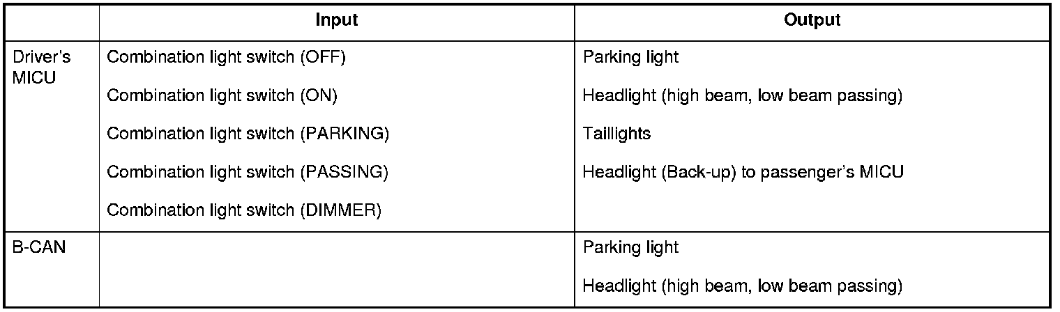 The driver's MICU control of the lighting system and horns is based on input signals of each switch and the B-CAN signals.