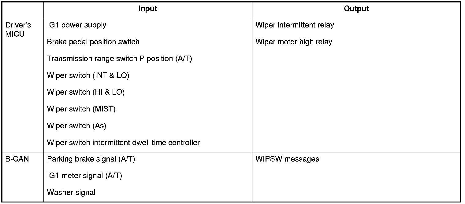 The driver's MICU control of the wiper is based on input signals from each switch.