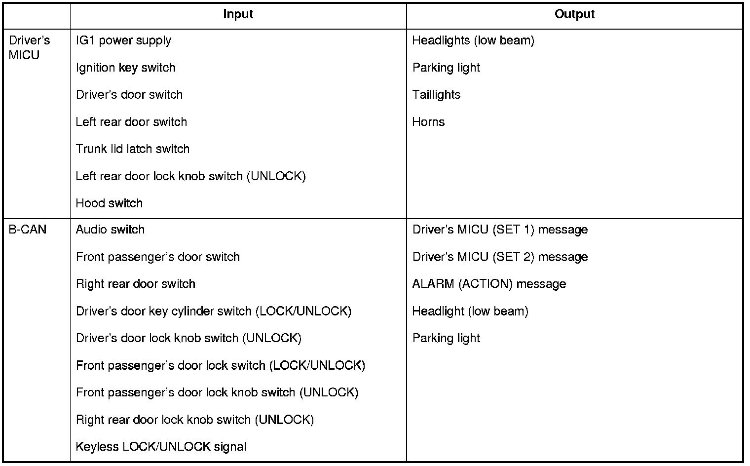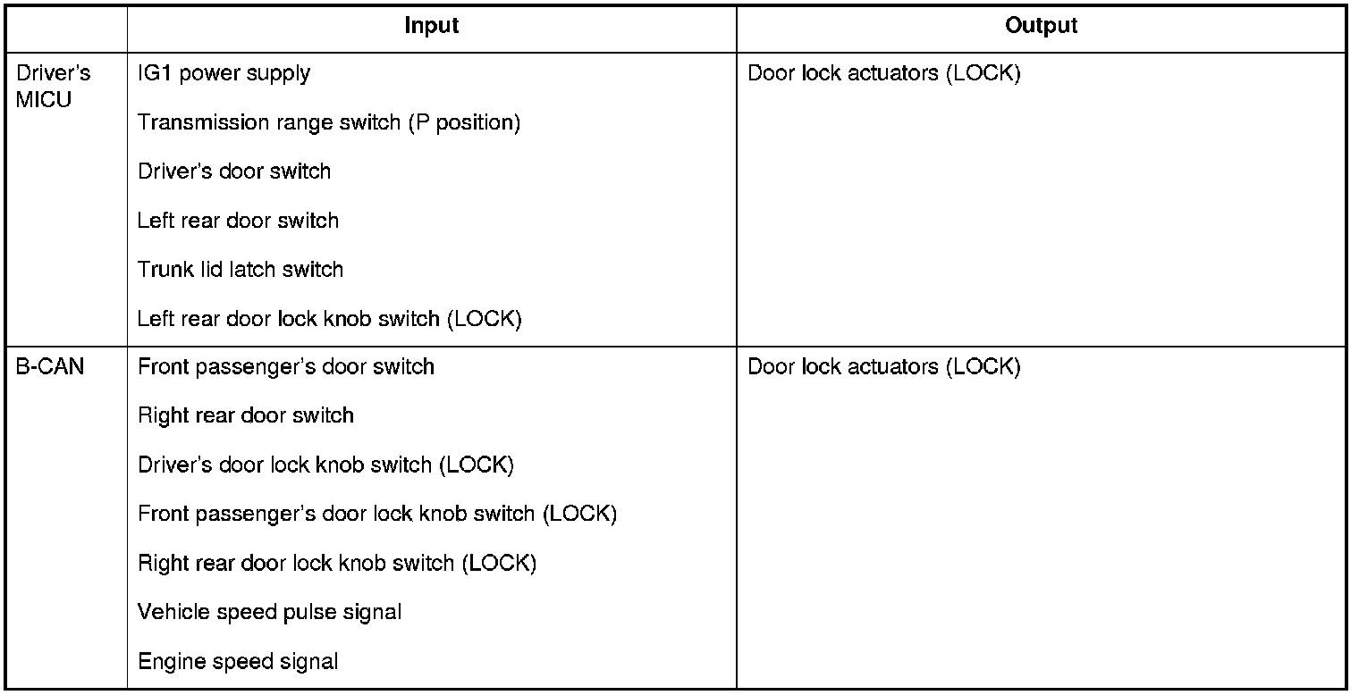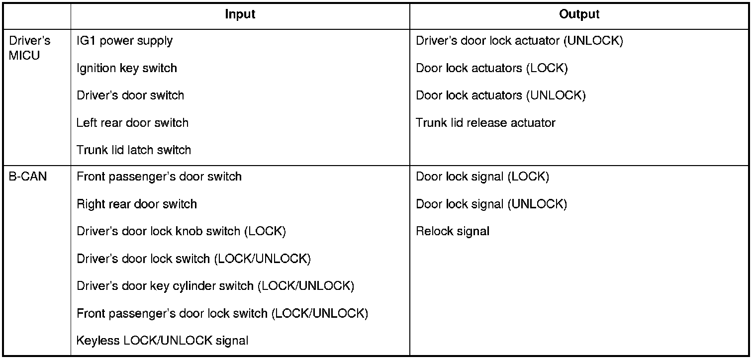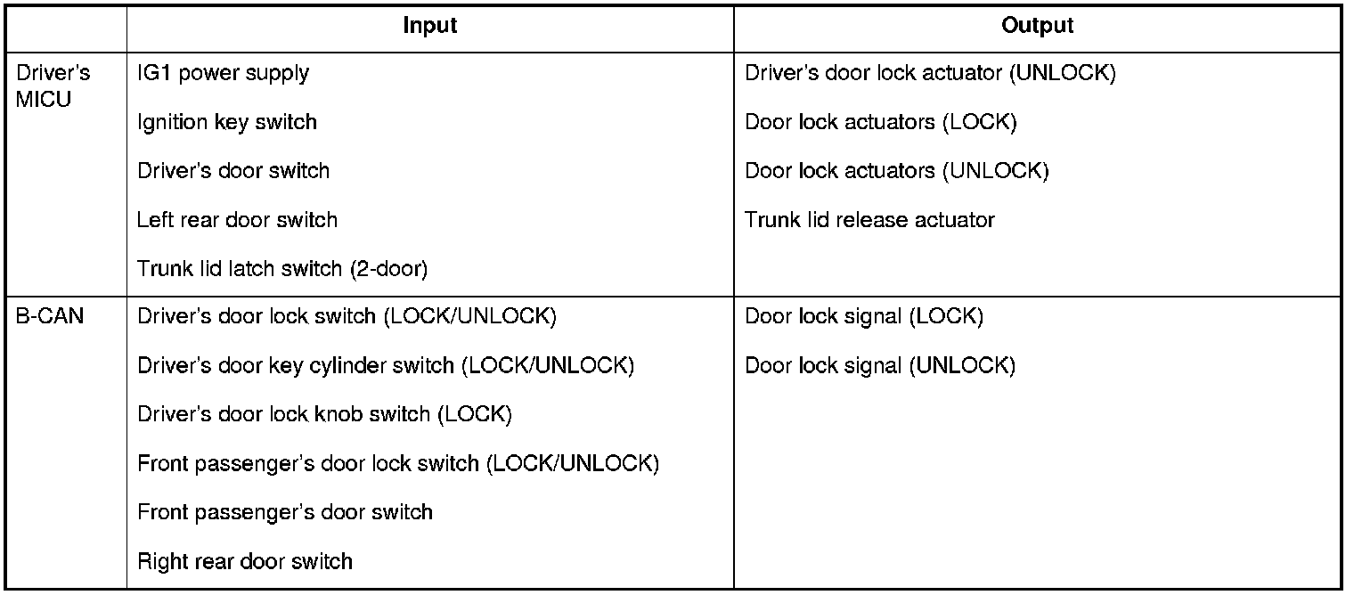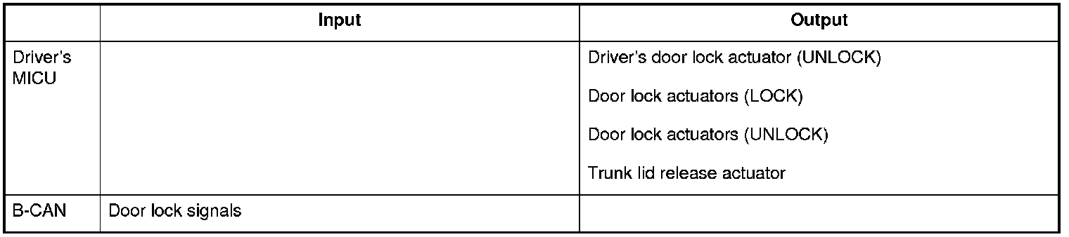 The driver's MICU control of the door lock actuators LOCK, UNLOCK, DRIVER'S UNLOCK, TRUNK UNLOCK is based on B-CAN door lock switch signals.