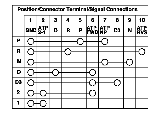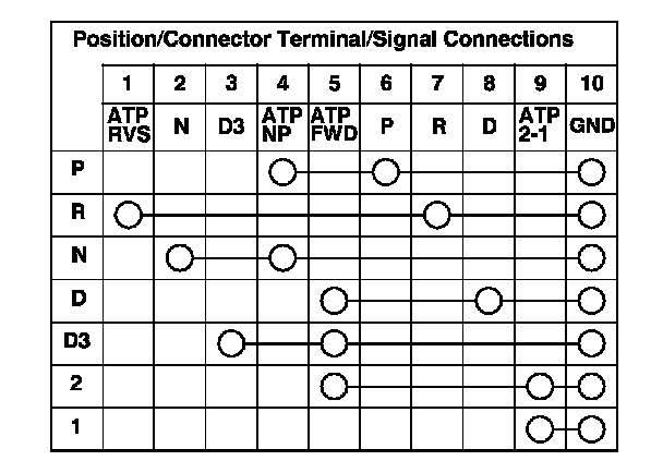 9. Check for continuity between the terminals at the transmission range switch connector. There should be continuity between the terminals in the following table for each transmission range switch position.