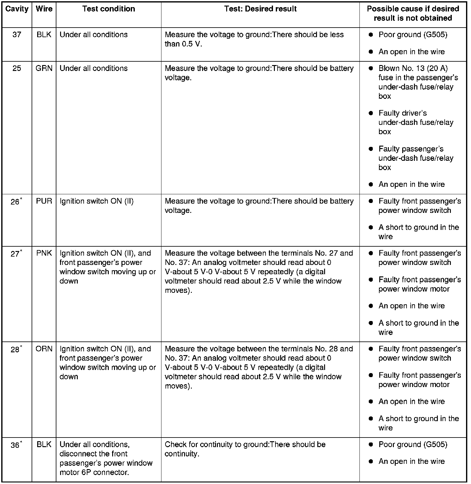 - If all the input tests prove OK, replace the front passenger's power window switch, then go to step 7.