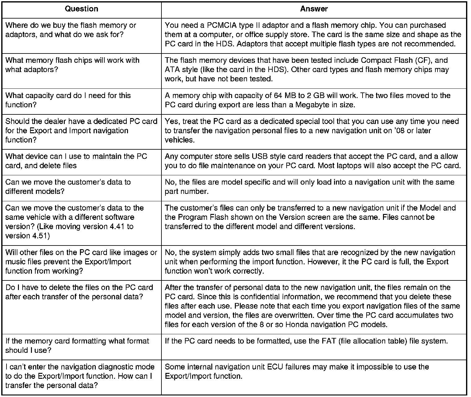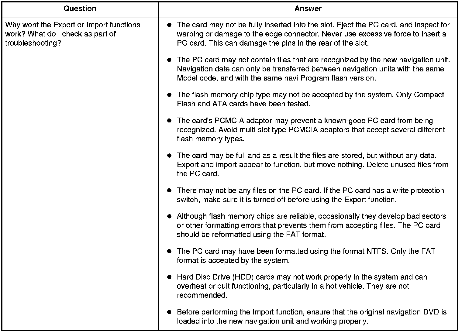 When replacing the navigation unit, this function allows the dealer to transfer the customer's personal data to the new navigation unit. The transferred information includes their Setup settings, and personal addresses. The dealer inserts a PC card to the navigation unit, and then selects the Save Users Memory function. The two functions in this diagnostic screen are EXPORT and IMPORT. EXPORT saves the customer's data to the PC card, and IMPORT moves the PC card files to the new navigation unit.