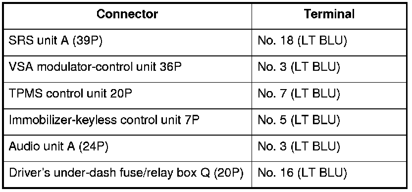 NO - Repair short in the wire between the DLC (K-line) and the VSA modulator-control unit, the SRS unit, the TPMS control unit, the immobilizer-keyless control unit, the audio unit, or the driver's under-dash fuse/relay box.