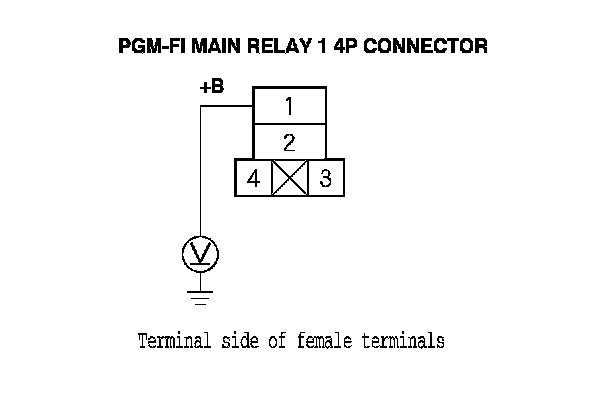67. Measure the voltage between PGM-FI main relay 1 4P connector terminal No. 1 and body ground.