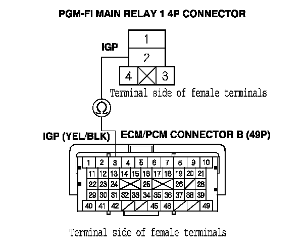 43. Check for continuity between PGM-FI main relay 1 4P connector terminal No. 2 and body ground.