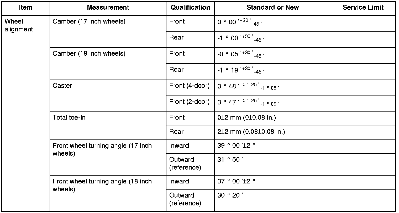 Wheel alignment Specifications