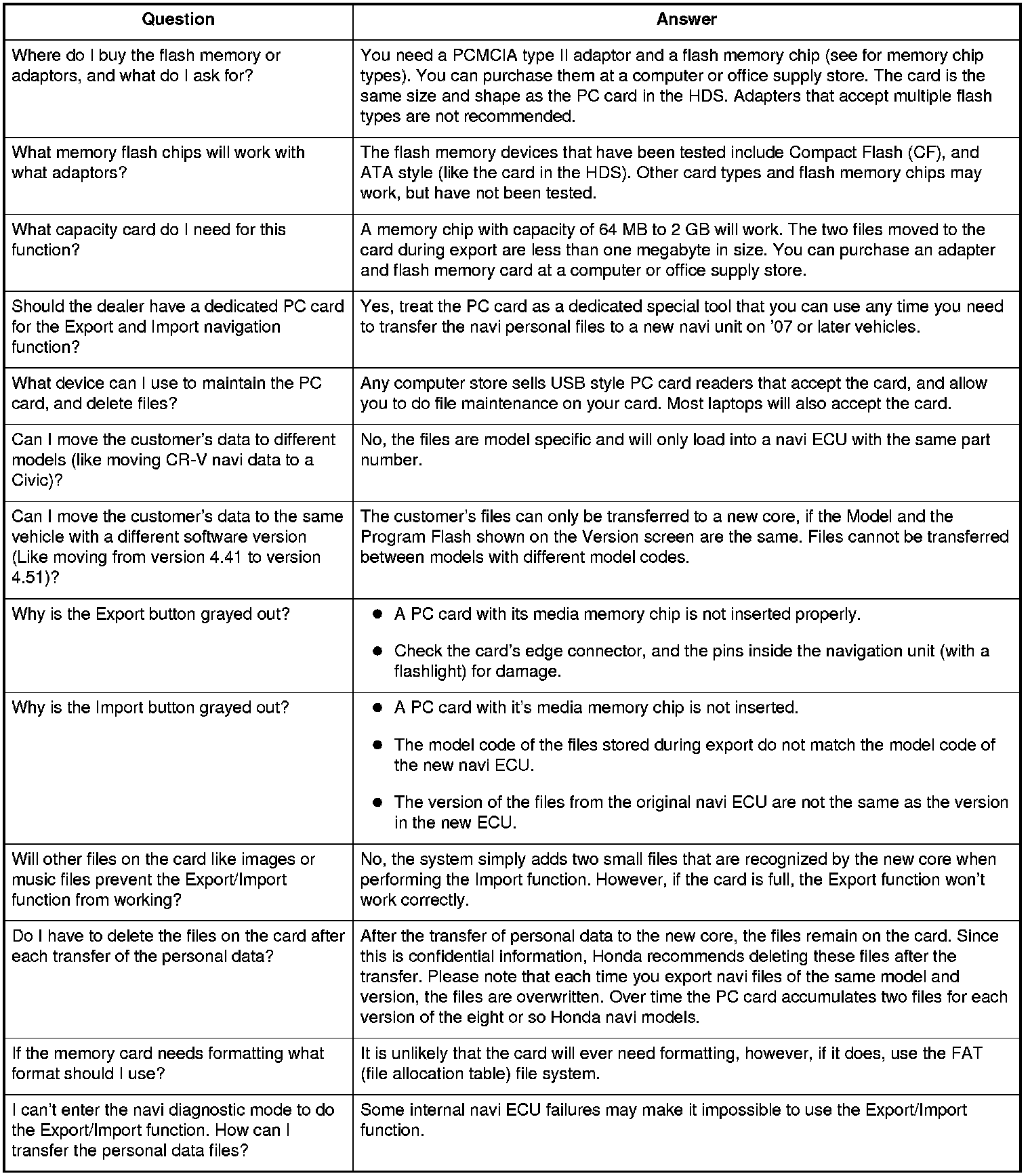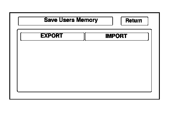 This is similar to saving and entering the customer's audio presets when replacing an audio core. The transferred information includes their Setup settings, and personal addresses. The dealer inserts a PC card (like the PC card in the HDS), and then selects the Save Users Memory function. The two functions in this diagnostic screen are Export and Import. Export saves the customer's data to the PC card, and Import moves the PC card files to the new navigation core.