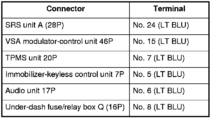 NO - Repair short in the wire between the DLC (K-line) and the VSA modulator-control unit, the SRS unit, the TPMS unit, the immobilizer-keyless control unit, the audio unit, or the under-dash fuse/relay box.