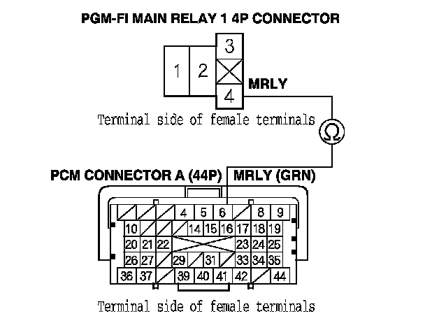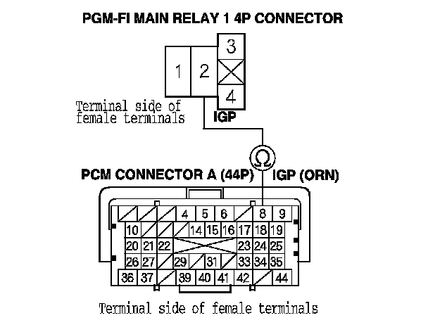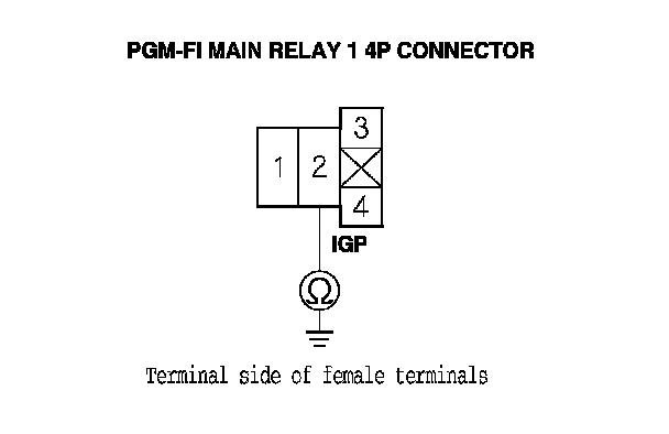 44. Check for continuity between PGM-FI main relay 1 4P connector terminal No. 2 and body ground.