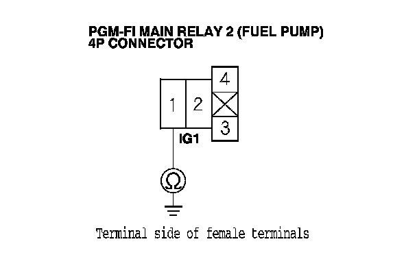 49. Check for continuity between PGM-FI main relay 2 (FUEL PUMP) 4P connector terminal No. 1 and body ground.