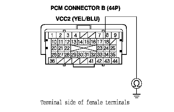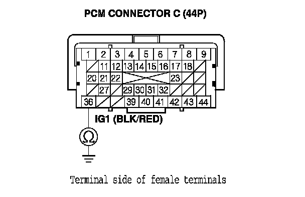 72. Check for continuity between body ground and PCM connector terminals B1, B36, C2, C40, and C44 individually.