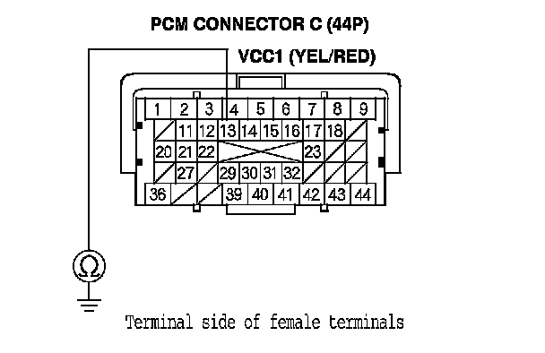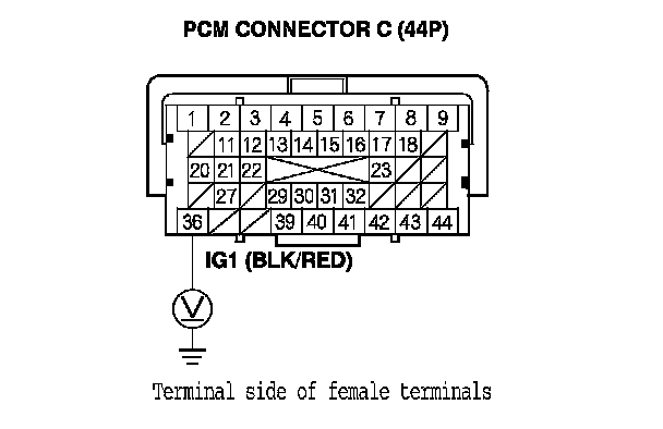 60. Measure the voltage between PCM connector terminal C36 and body ground.