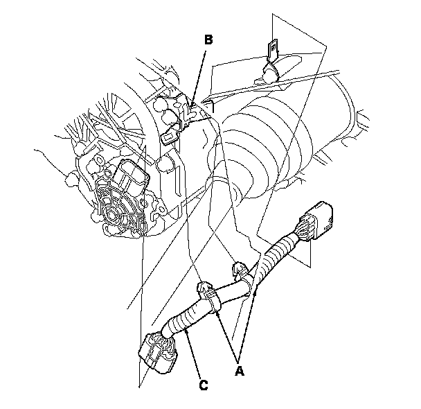 8. If the transmission range switch continuity check is OK, remove the harness clamps (A) from the clamp bracket (B), and replace the faulty transmission range switch harness (C).