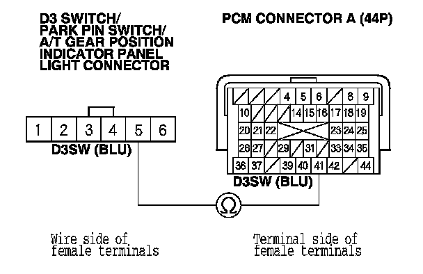 8. Check for continuity between PCM connector terminal A41 and D3 switch/park pin switch/A/T gear position indicator panel light connector terminal No. 5.