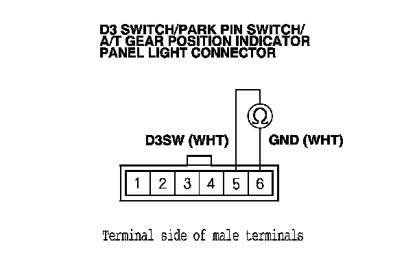 9. Check for continuity between D3 switch/park pin switch/A/T gear position indicator panel light connector terminal No. 5 and body ground.