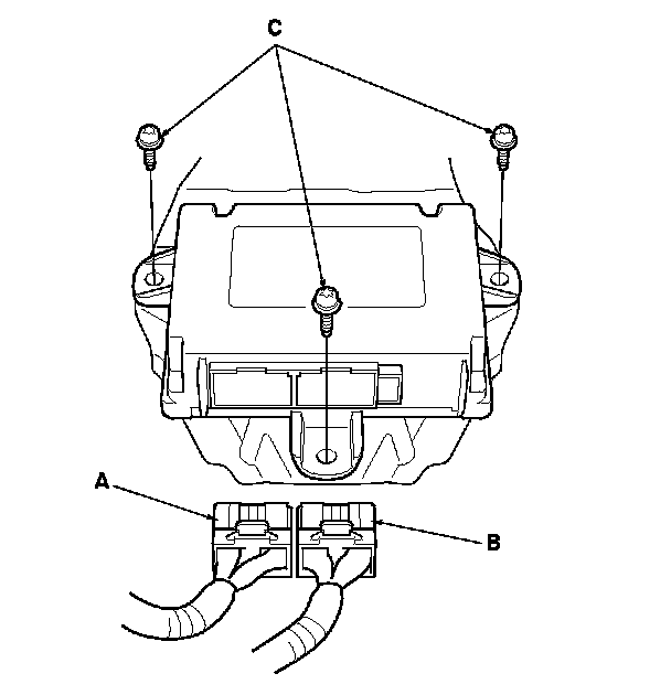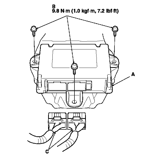 1. Install the SRS unit (A) with new TORX bolts (B), then connect the connectors (C) to the SRS unit; push them into position until they click.