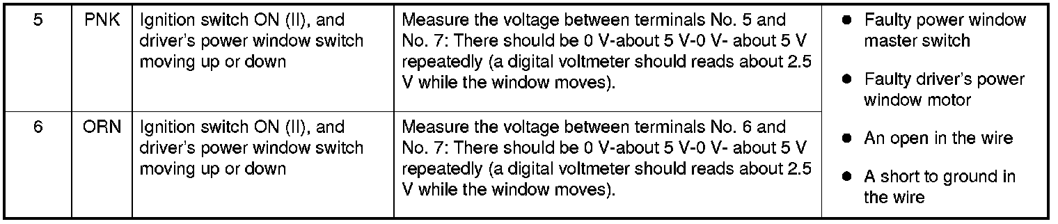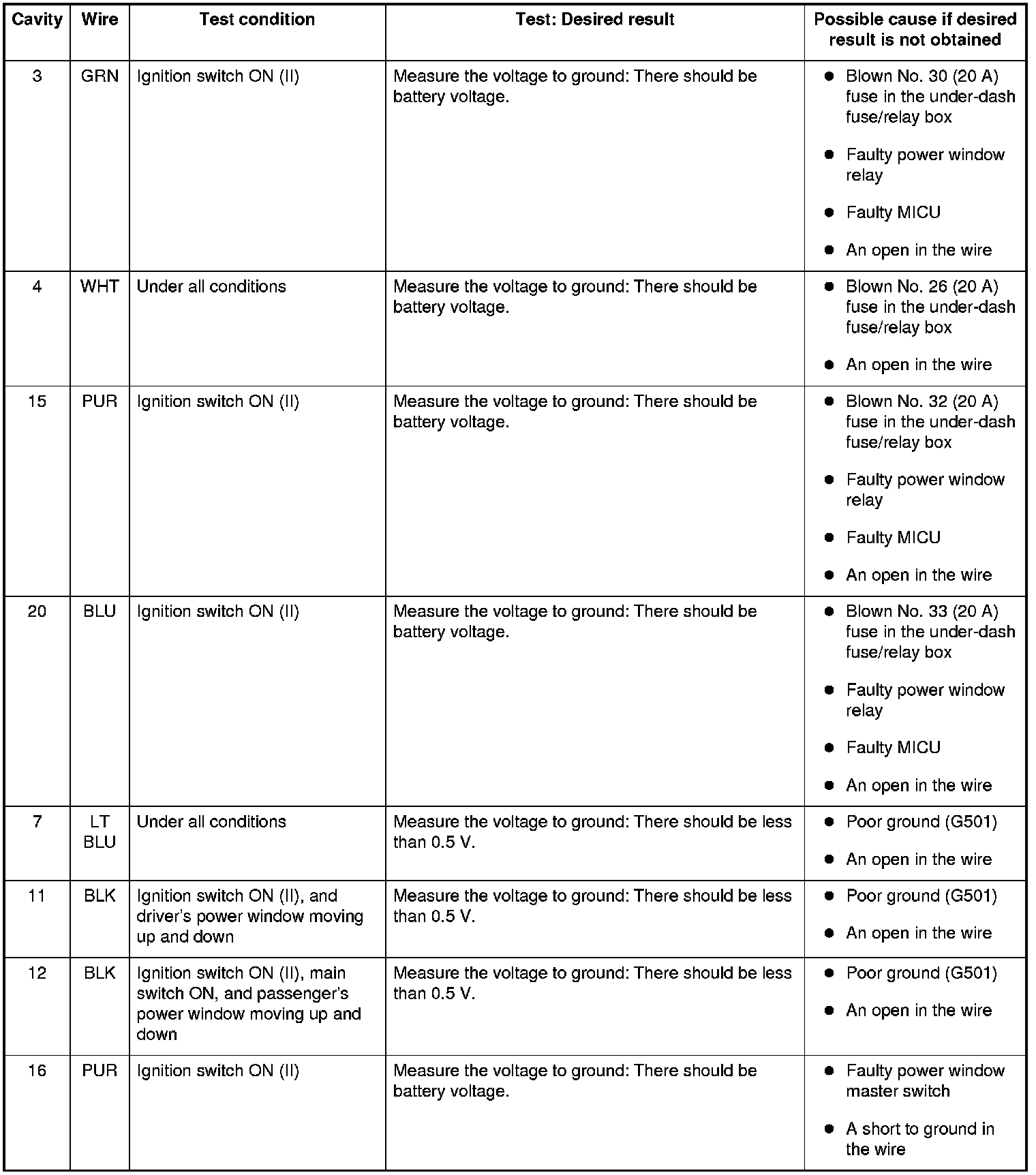 - If all the input tests prove OK, the control unit must be faulty; replace the power window master switch, and go to step 6.