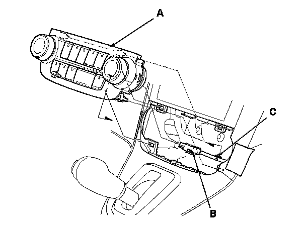 4. Remove the HVAC control unit (A). Disconnect the connector (B), then remove the harness clip (C).