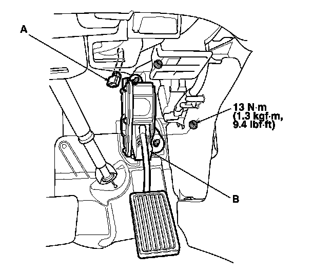 2. Remove the accelerator pedal module (B).