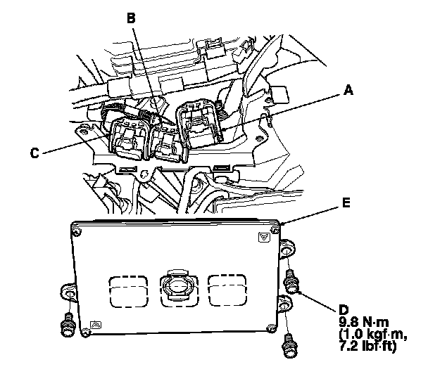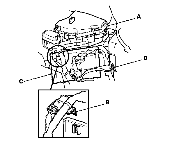 13. Loosen the battery hold down bolt (D), and reposition the battery away from the PCM.