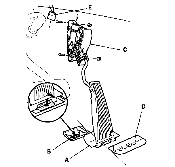 3. Push the tab (C), and remove the accelerator pedal pad (D) from the pedal stop (E).
