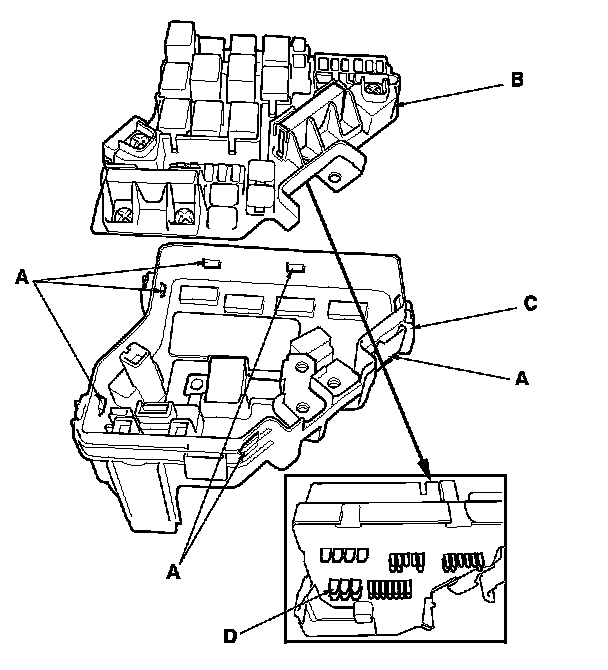 5. Turn the housing over again. Using two flat-tip screwdrivers, release the tabs (A), and pry up the fuse/relay box base (B) from the fuse/relay box housing (C).