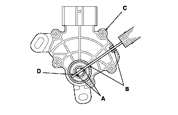 6. Align the cutouts (A) on the rotary-frame with the neutral positioning cutouts (B) on the transmission range switch (C), then put a 2.0 mm (0.08 in.) feeler gauge blade (D) in the cutouts to hold the switch in the N position.