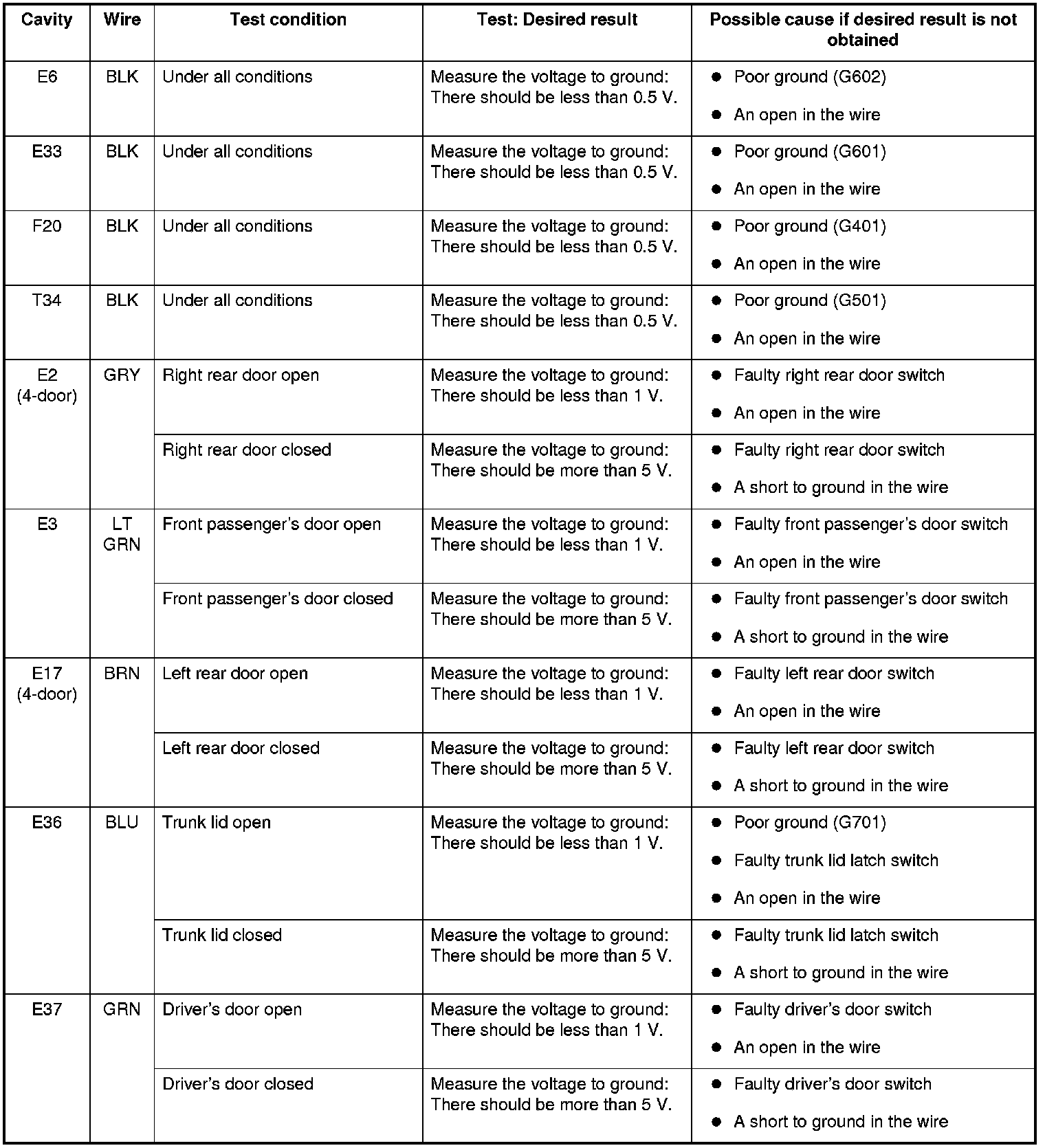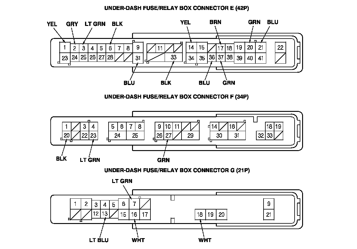 6. Reconnect the connectors to the under-dash fuse/relay box, and do these input tests at the following connectors.