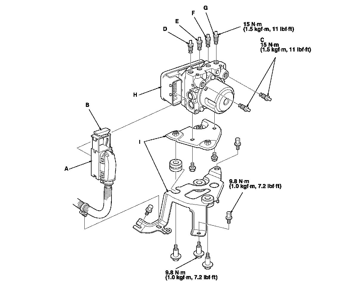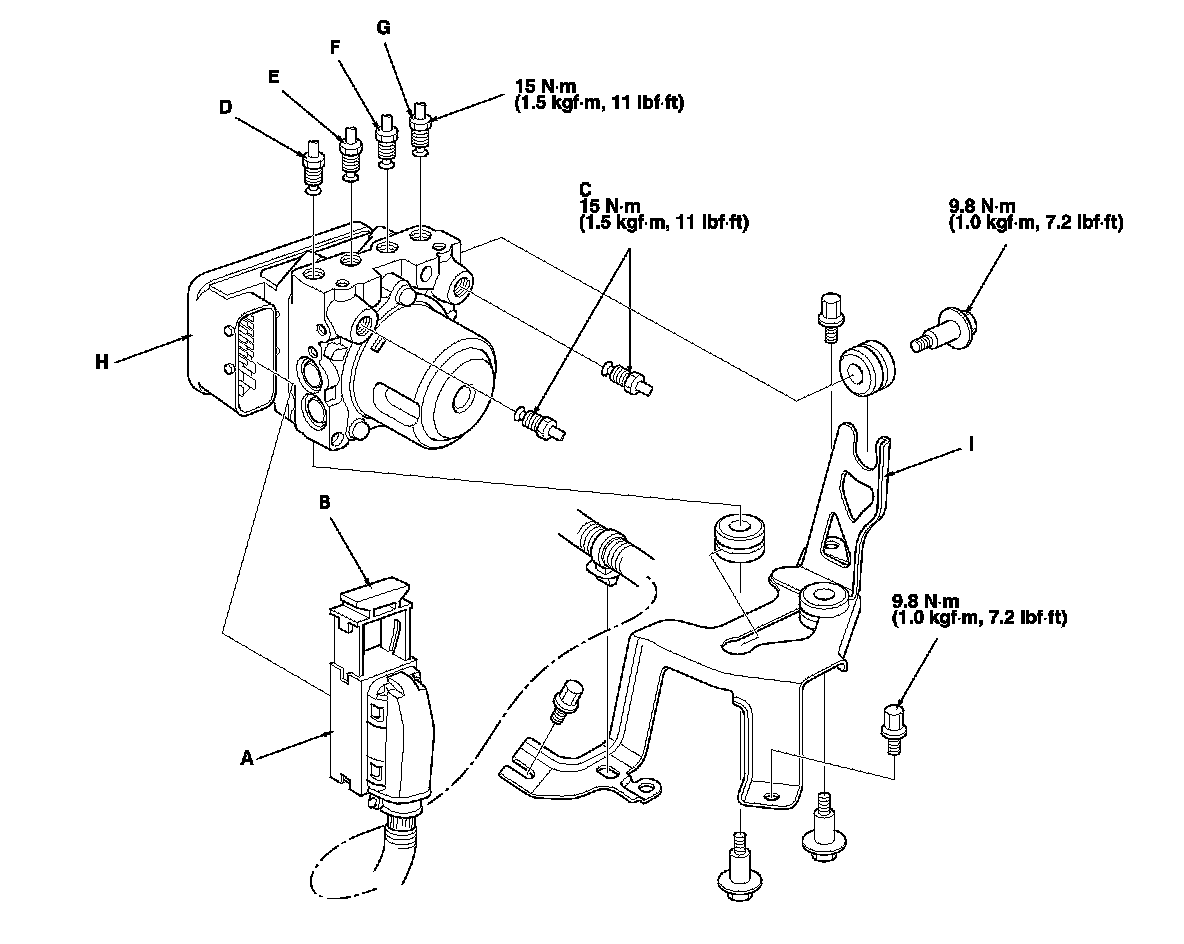 4. Remove the ABS modulator-control unit (H) with the bracket (I) from the body.