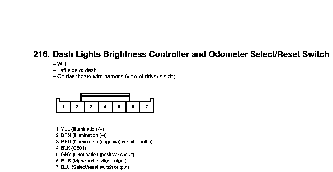 View 216 Dash Lights Brightness Controller and Odometer Select/Reset Switch Connector View