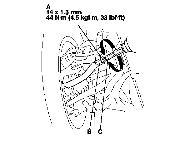 3. Hold the adjusting bolt (A) on the trailing arm (B), and loosen the self-locking nut (C).