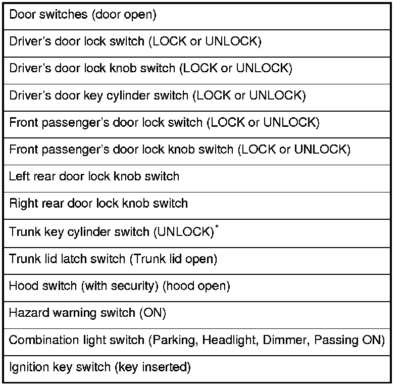 When the ignition switch is turned ON (II), the MICU, gauge control module, immobilizer-keyless control unit-receiver, and ECM/PCM wake up at the same time without "talking" to each other through the communication lines. When any switch in the multiplex integrated control system is turned on, it wakes up its related control unit which, in turn, wakes up the other units. After confirming the sleep mode, look in the following table for the switch most related to the problem. Operate that switch and see if its control unit wakes up.