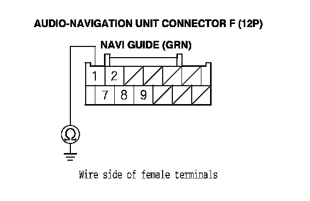 6. Check for continuity between body ground and audio-navigation unit connector F (12P) terminal No. 1.