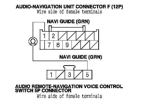 7. Check for continuity between audio-navigation unit connector F (12P) terminal No. 1 and audio remote-navigation voice control switch 5P connector terminal No. 5.